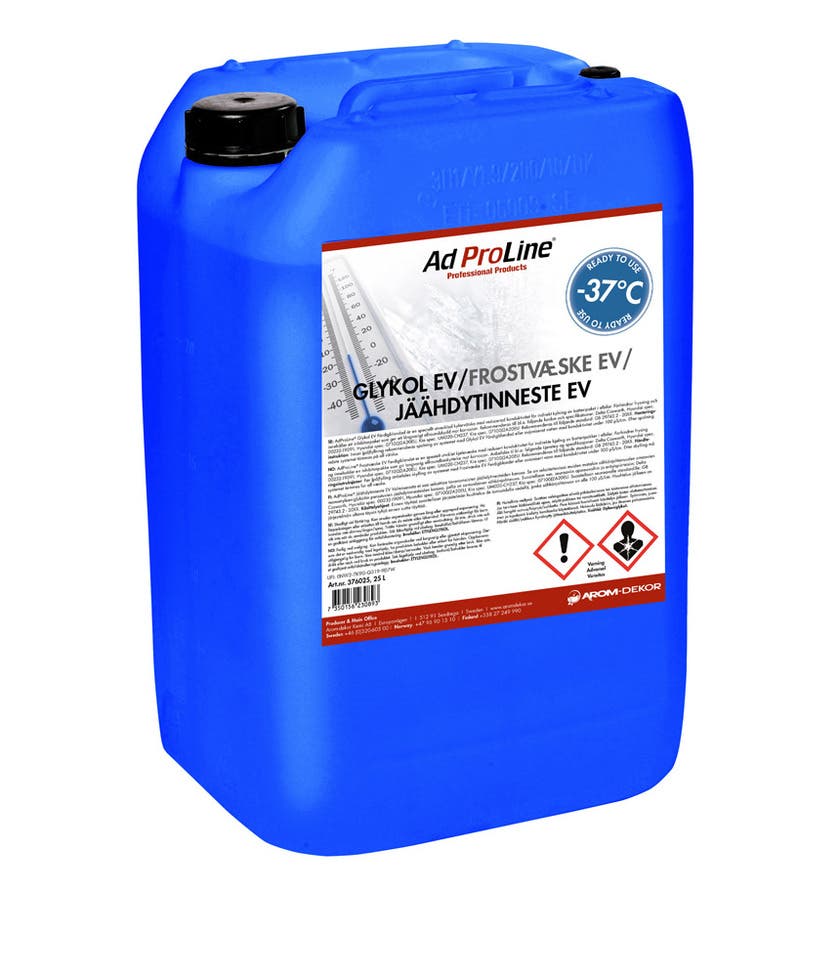 AdProLine® Frostvæske EV Ferdigblandet er en spesielt utviklet kjølevæske med redusert konduktivitet for indirekte kjøling av batteripakker i elbiler. Forhindrer frysing og inneholder en inhibitorpakke som gir langvarig allroundbeskyttelse mot korrosjon. Takket være den unike kombinasjonen av inhibitorer og stabilisatorer sikrer Frostvæske EV Ferdigblandet lav og stabil elektrisk ledningsevne over lang tid i kjølesystemet. Frostvæske EV Ferdigblandet gir effektiv frostbeskyttelse ned til -37°C.
