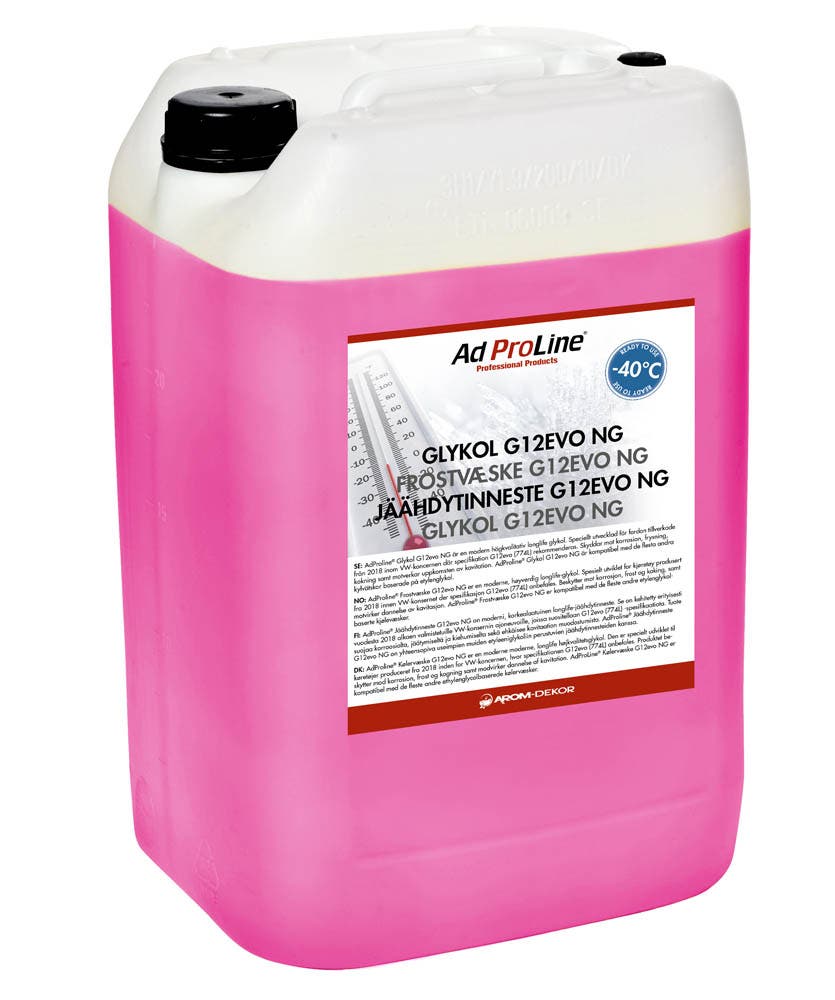 AdProLine® Frostvæske G12evo NG er en moderne longlife-glykol av høy kvalitet. Spesielt utviklet for kjøretøy produsert fra 2018 innen VW-konsernet, der spesifikasjon G12evo (774L) anbefales. Produktet beskytter mot korrosjon, frost og koking, samt motvirker kavitasjon. AdProLine® Frostvæske G12evo NG er
