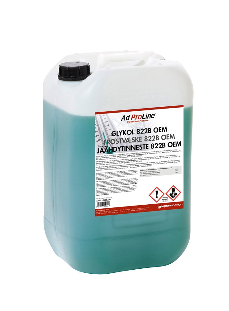 AdProLine® Frostvæske 822B OEM består av monoetylenglykol og en inhibitorpakke basert på en kombinasjon av OAT-teknikken (Organic Acid Technology) og molybdat. OAT innebærer en langtidsvirkende korrosjonsbeskyttelse når bare en liten del av inhibitoren konsumeres. Inneholder ikke nitriter, aminer, fosfater, silikater eller borater. Sjekk radiatorfrostvæskens frostbeskyttelse hver høst og etterfyll om nødvendig. Etylenglykol er giftig og må ikke drikkes. Det er biologisk nedbrytbart og utslipp av mindre mengder forårsaker ingen forstyrrelser i renseanleggene.