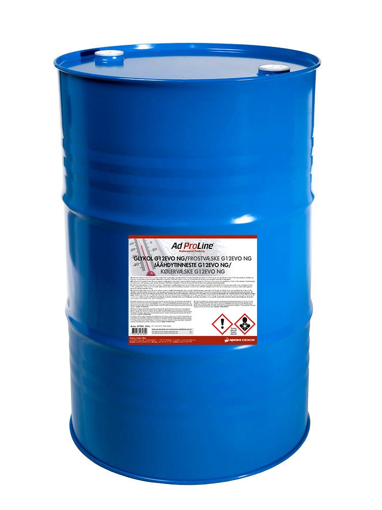 AdProLine® Frostvæske G12evo NG består av monoetylenglykol og en inhibitorpakke basert på OAT samt silikat, som gir utmerket korrosjonsbeskyttelse for de fleste metaller, inkludert aluminium. Inneholder ikke 2-EHA, aminer, borater, fosfater eller nitritter. Kontroller frostbeskyttelsen i kjølevæsken hver høst og etterfyll ved behov. Etylenglykol er giftig og må ikke inntas. Produktet er biologisk nedbrytbart, og utslipp av mindre mengder forårsaker ikke forstyrrelser i renseanleggenes biologiske nedbrytningsprosesser.