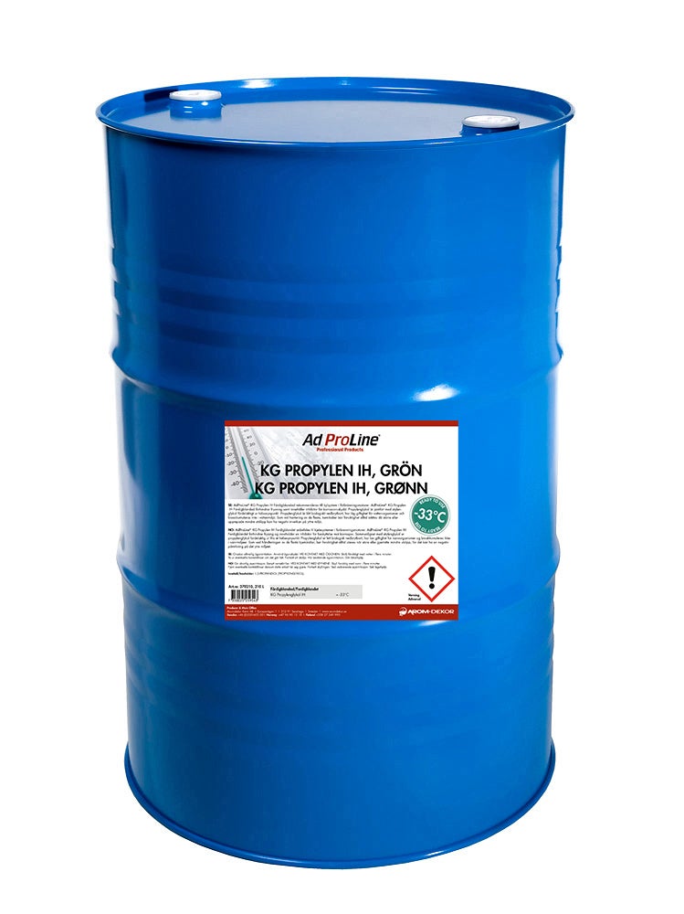 AdProLine® KG Propylen IH Ferdigblandet er basert på propylenglykol og en inhibitorpakke uten nitriter, aminer, fosfater, silikater og borater. Propylenglykol er, sammenlignet med etylenglykol, mer fordelaktig ut ifra miljø og helse synpunkter. AdProLine® KG Propylen IH Ferdigblandet er biologisk nedbrytbar, har lav giftighet for akvatiske organismer og bioakkumuleres ikke i vannmiljø. Som ved all håndtering av de fleste kjemikalier, bør man alltid være forsiktig, da større eller gjentagende små utslipp kan ha en negativ påvirkning på det ytre miljøet. AdProLine® KG Propylen IH Ferdigblandet skal ristes/røres før påfylling.