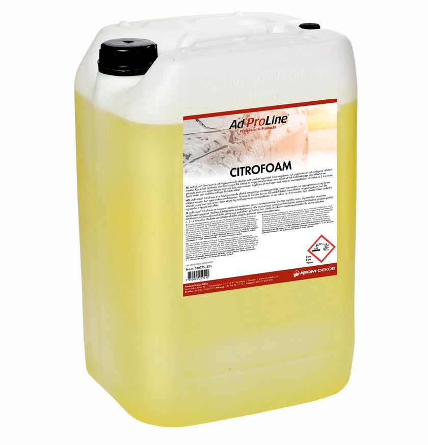 AdProLine® Citrofoam er et høytskummende alkalisk rengjørings-/avfettingsmiddel som egner seg til vask av både kjøretøy, fasader og andre flater. Løser effektivt opp veistøv, sot, pigmentsmuss og fjerner enkelt insekter. Kan også brukes som bilsjampo. Ved hjelp av en skumapplikator dekker du enkelt en hel lastebilekvipasje på noen minutter, og det rengjørende skummet blir sittende på og løser opp smusset.